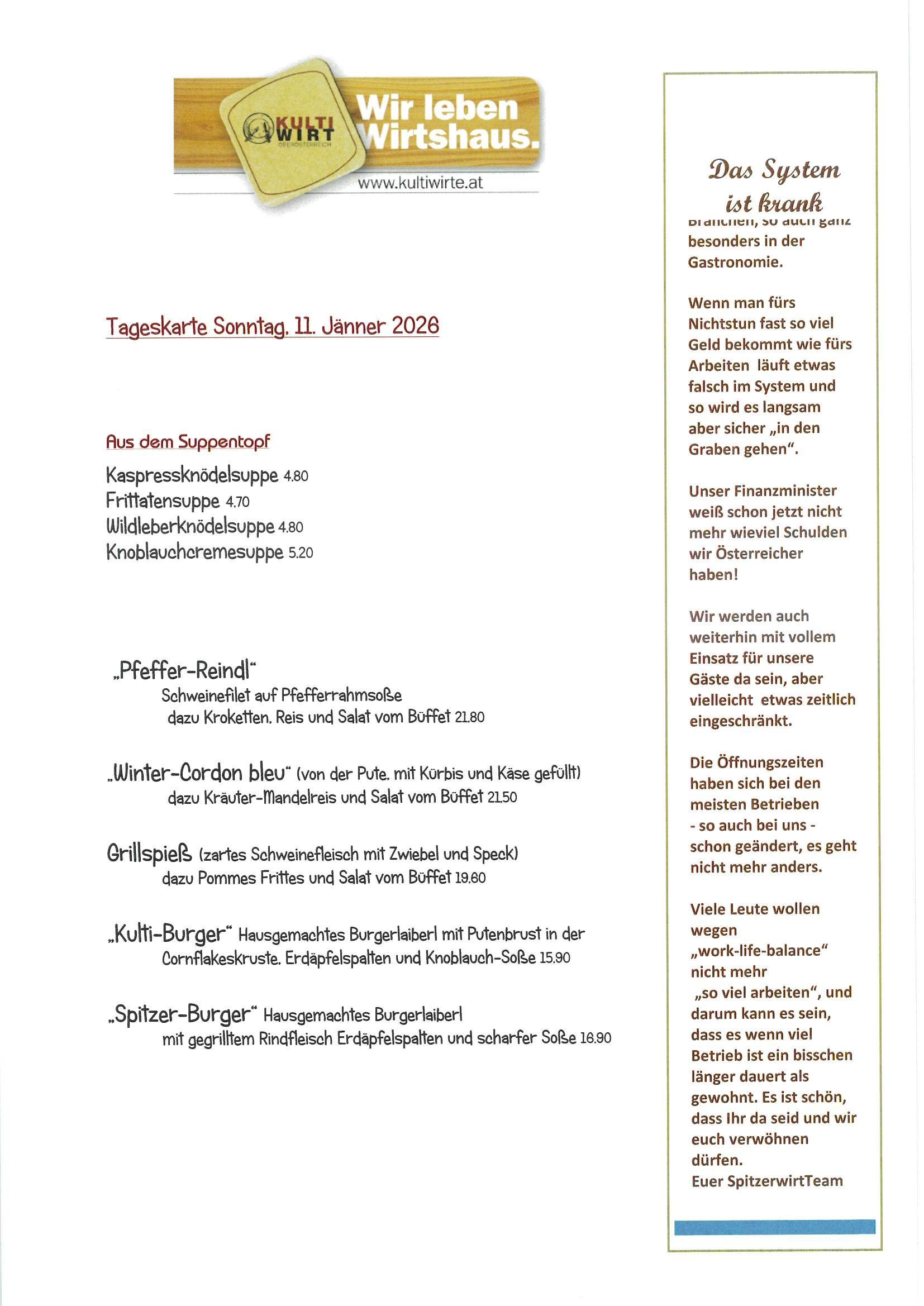 Wir bitten um Verständnis, dass es zu den Stoßzeiten (wie z. B. Sonntagmittag) eine etwas kleinere Speisenauswahl gibt und Umbestellungen nicht möglich sind.
